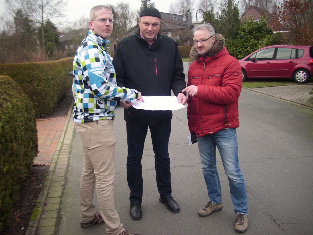 Stefan von Aschwege (Mitte) und Andreas Janßen (re.) erklärten dem CDU-Fraktionsvorsitzenden Dr. Matthias Bollmeyer (li.) die Abwasserproblematik im Stadlander Weg.Als erfolgreich habe sich allerdings bisher schon die Versiegelung der Regenwasserschächte im Stadlander Weg erwiesen, da bei den letzten Starkregenereignissen die für die Straße zuständige Pumpstation am Moorlandsweg problemlos gearbeitet hat. Das bedeute, dass das Hochwasser durch Wasser entstehe, das aus dem höher gelegenen Harlinger Weg herab in die Straße laufe. „Die EWE ist zu dieser Thematik auch bereits im Gespräch mit der Stadtverwaltung. Ich hoffe deshalb, dass bald die einzelnen Maßnahmen umgesetzt werden können“, sagt Bollmeyer, der mit der CDU-Fraktion das Anliegen in die städtischen Gremien tragen und weiterverfolgen will. Der vor einigen Jahren erstellte Bahndurchlass in der Nähe, dessen Planung fast sieben Jahre in Anspruch genommen habe, sei im Übrigen nicht für die Entwässerung des Stadlander Wegs zuständig, so die EWE. Vielmehr werde hier das Oberflächenwasser aus der Richtung des Stellwerks abgeleitet.
